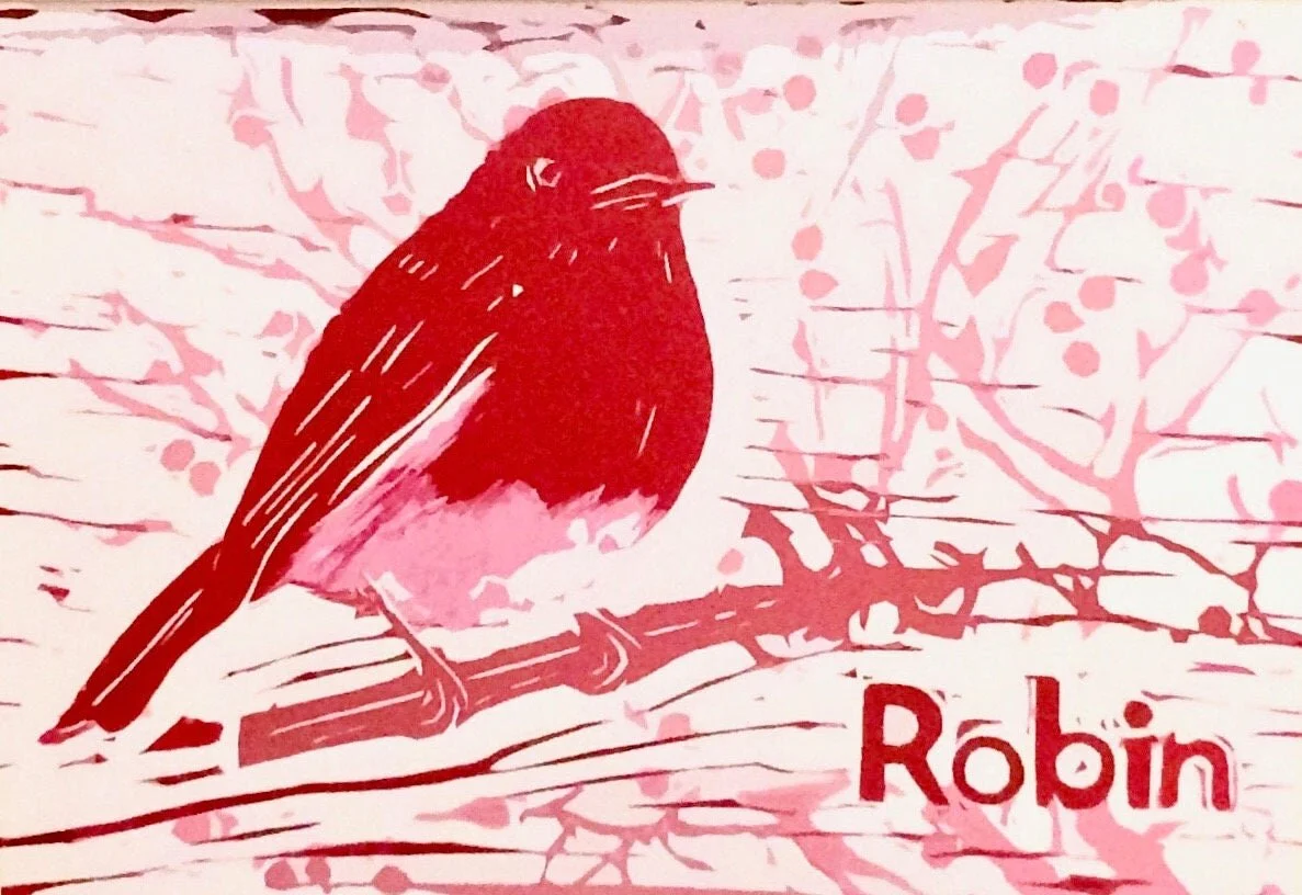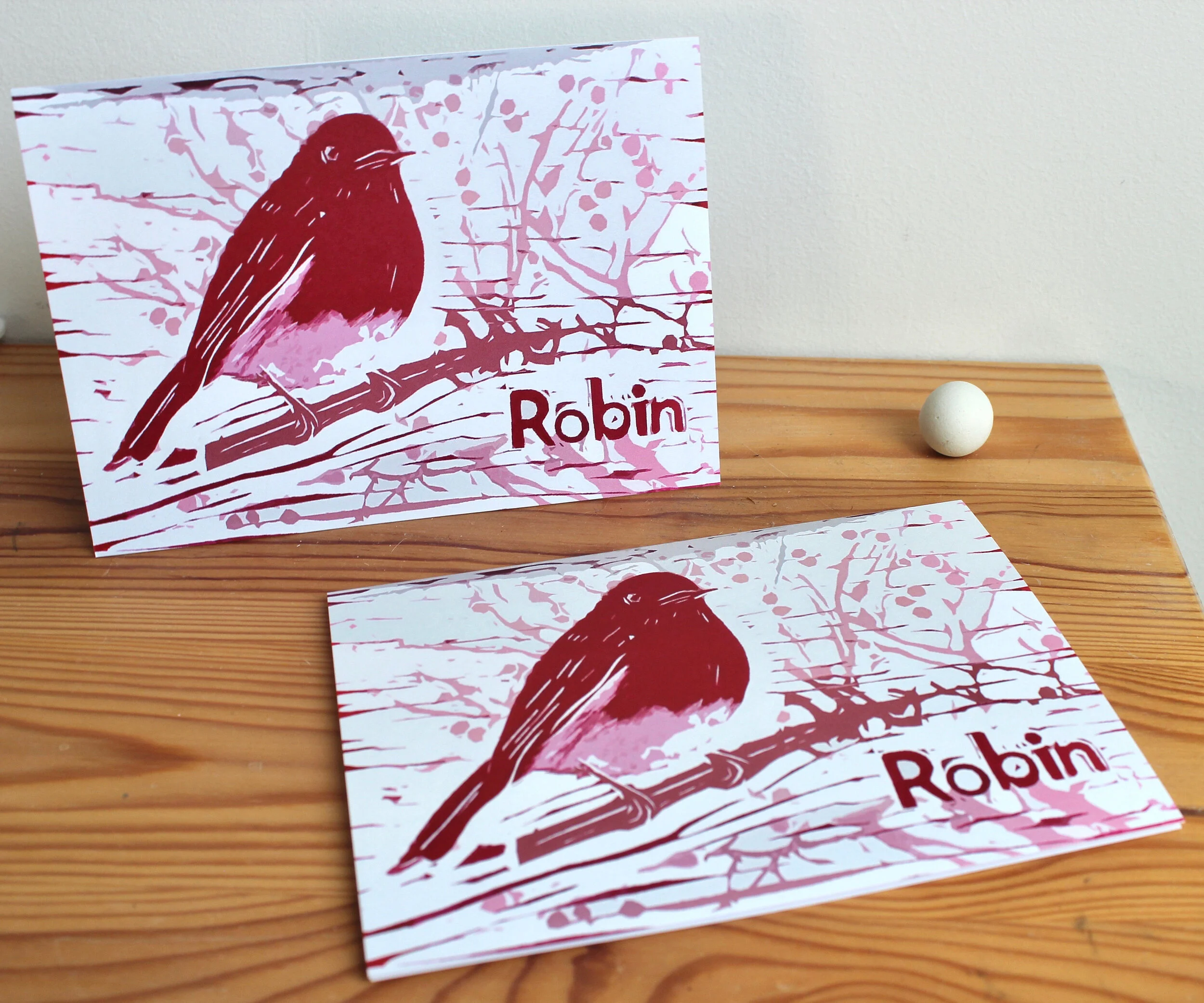 Robin Christmas card based on an original lino print made by the artist, digitally printed on good quality card.